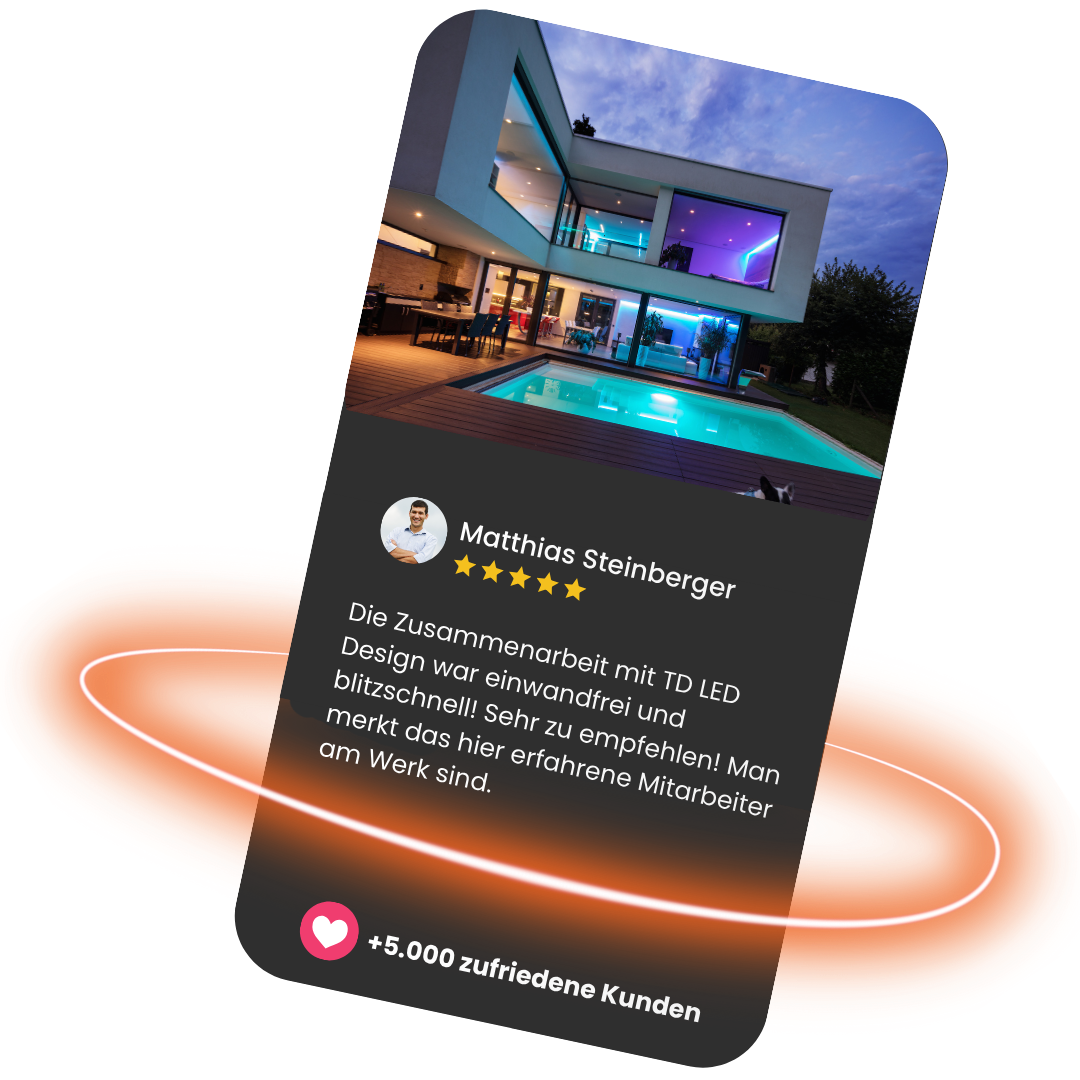 Wetterfeste LED-Systeme für Haus, Garten und Gewerbeflächen – langlebig, energieeffizient und individuell steuerbar. Wir schaffen Licht, das Sicherheit und Stil perfekt verbindet.